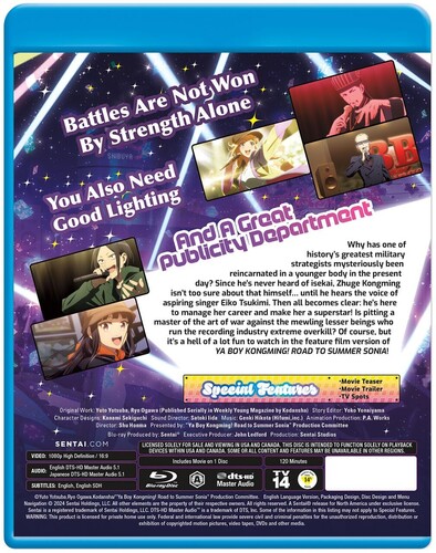 Why has one of history's greatest military strategists mysteriously been reincarnated in a younger body in the present day? Since he’s never heard of isekai, Zhuge Kongming isn’t too sure about that himself… until he hears the voice of aspiring singer Eiko Tsukimi. Then all becomes clear: he’s here to manage her career and make her a superstar! Is pitting a master of the art of war against the mewling lesser beings who run the recording industry extreme overkill? Of course, but it’s a hell of a lot fun to watch in the feature film version of YA BOY KONGMING! ROAD TO SUMMER SONIA!