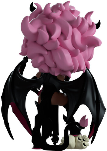 Standing at 5 inches tall with her foot resting on a pile of skulls, a sharp smile shines through Drolta's black lips as two long spiraling horns stretch out from her head above bright pink pushed back hair. With a dark pink gem on her forehead that matches the earrings hanging from her pointed ears, sharp bat wings with hot pink interiors curl around her body as straps from her black bodice run up over her chest as the waist drapes down to the ground. Wearing long black gloves with pink hands and thigh high black boots, a long tail snakes out from her back with a bright pink tip.