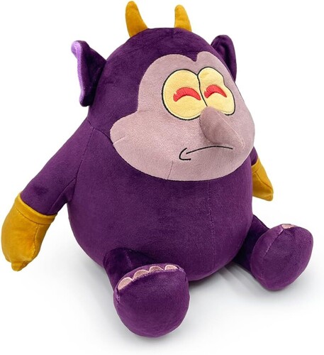 Slumped down with his feet kicked forward and brown gloved hands resting at his sides, he sits at 9 inches tall with a slight frown curving over his mouth. His bright yellow eyes are joined at the middle and shine with bright red pupils while two pointed ears sit at the sides of his head which have short horns emerging from its top. In true demon form, he has small bat-like wings emerging from his wide back and a long thin pointed tail that wraps around to his front.
