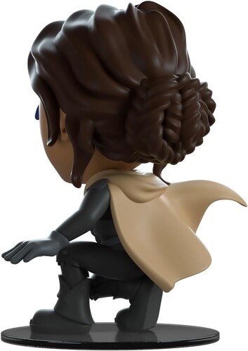 The world of DUNE has arrived to Youtooz in this epic new collaboration! Crouching at 4.3 inches, Chani has a serious look on her face with her eyebrows furrowed and her lips forming a straight line. She is posed in a way that shows she's cautious of her surroundings, with both her hands floating around her so she is ready for anything that may happen. She is dressed in a black Stillsuit with a dark cream colored cloak that is swaying in the wind. In her nose is a Filt-Plug that helps collect moisture. Her hair is styled in a braided bun with some pieces left out that are framing her face. The iconic Youtooz eyes are painted a bright blue color.