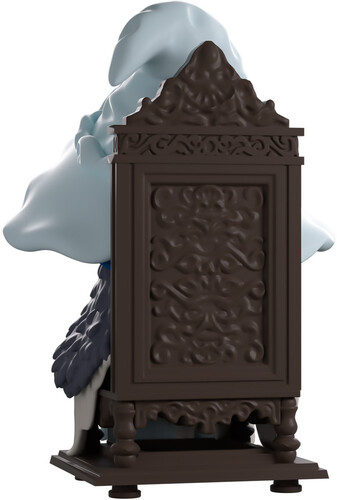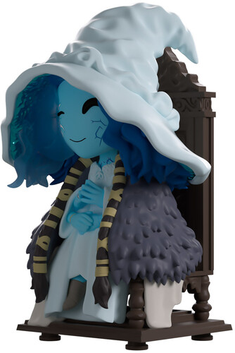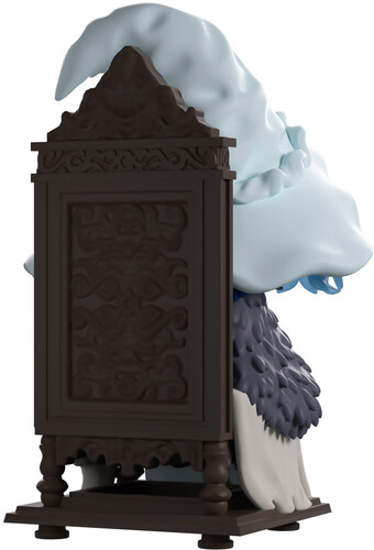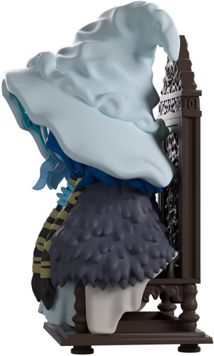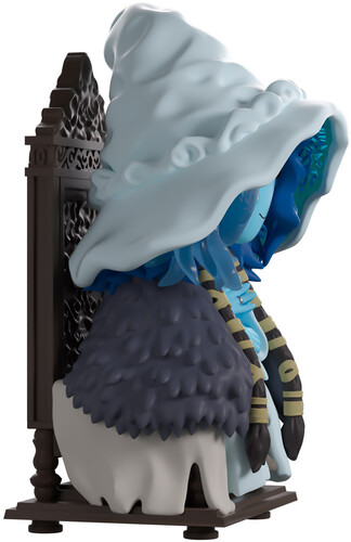 Youtooz has entered into Ranni’s service to bring you her debut! Sitting at 4.7 inches tall atop a simple yet ornate wooden chair and peering out from underneath the brim of a wide white, a simple smile crossed her soft blue face that’s covered in cracks and a white marking over one eye as a second spectral face floats to the side.