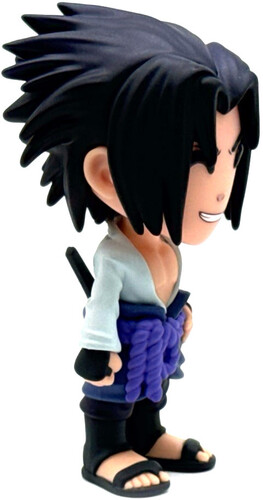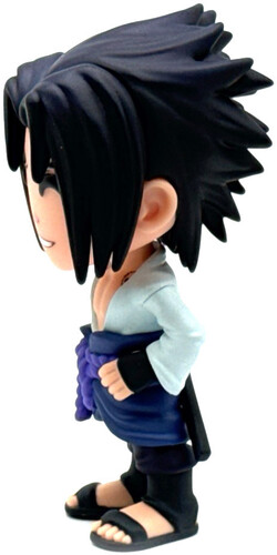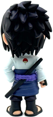 Standing at 4.6 inches tall Sasuke is posed with one hand smugly resting on his hip and a superior grin, With his shoulder length black hair spiked out at the back as the fringe parts in the middle to frame his face, his white long sleeve shirt opens wide to reveal his bare chest and the black seal mark on the left side of his neck. A purple rope is tied around his dark blue wait cloth and holds a sword in place across his back. He’s dressed in dark blue pants, hand guards and brown open toe sandals.