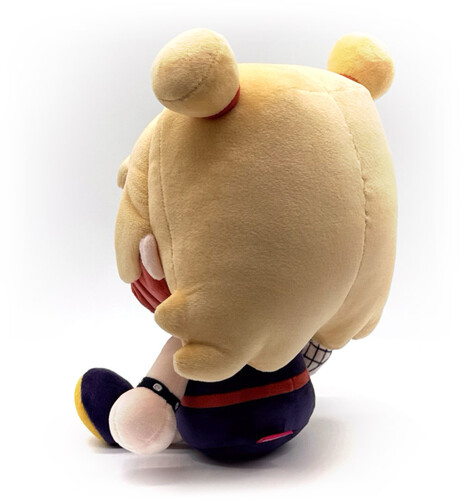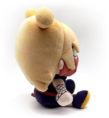 Sitting at 9 inches tall with frustrated eyes peering out from above a red oni mask that has dark orange teeth, blond hair falls over her face and is pulled into a pair of small buns atop her head with thin red bands. Dressed in a dark blue sleeveless jumpsuit with a hood and red belt around the waist, one arm has a studded wristband while the other is covered in netting as she wears blue and yellow calf-high shoes.