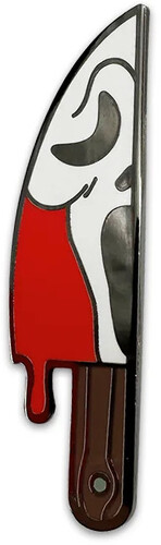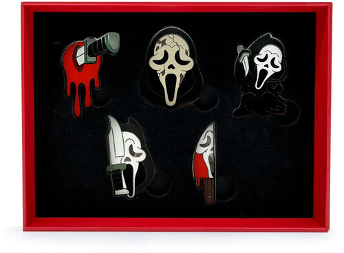 This 5 piece Ghost Face pin set is to die for! This pin set contains 5 unique and high-quality enamel pins with a shiny finish. The Ghost Face pin set includes a knife stabbing something with blood around it, a cracked and discolored Ghost Face mask, Ghost Face with their right arm raising a knife, a Ghost Face mask that is half covered by a knife, and a bloody knife with a Ghost Face mask reflecting in the blade.