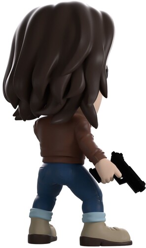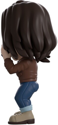 Watch out, Ghost Face! Sidney’s arrived at Youtooz in search of vengeance with her vinyl debut! Standing at 4.5 inches tall, with a look of concern flashing across her face as dark eyebrows furrow over a worried mouth, her long brown hair parts to the side and falls down to her shoulders in thick strands. Holding a phone to her ear with her left hand, as the right grips the handle of a black pistol, she’s dressed in a brown leather jacket over a v-neck black top, as the rolled cuffs of her tight blue jeans rest above pale boots.